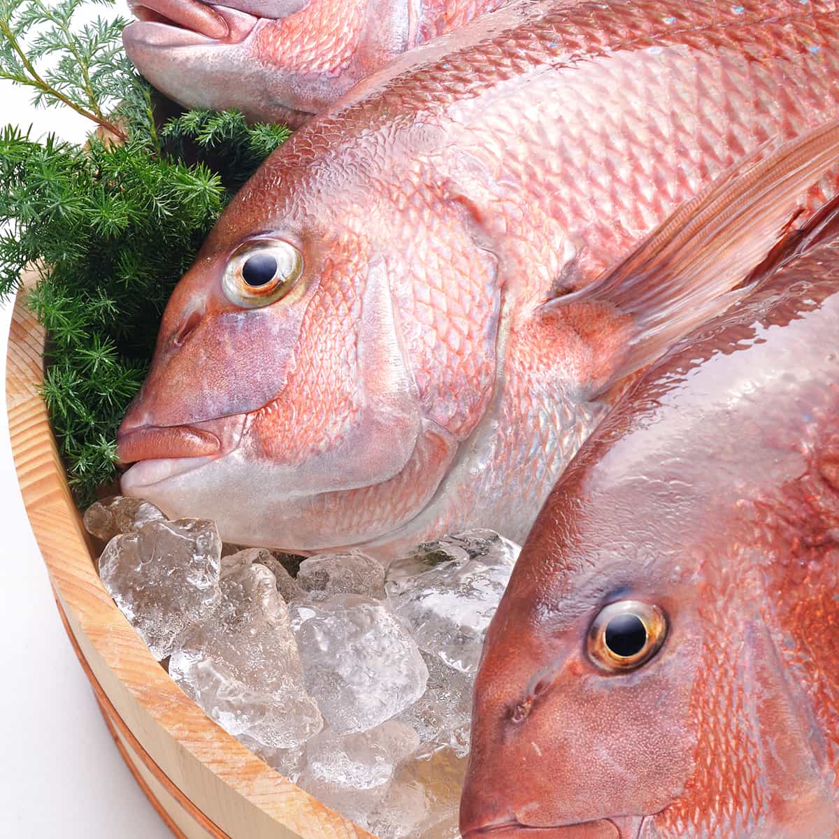 山崎真鯛は独自配合の餌で餌由来の水分・脂質を抑制し、筋繊維が細かく均一。養殖臭が少なく、旬の天然鯛に近い脂質で鮮度長持ち、じっくり大きく育てた高品質真鯛です。