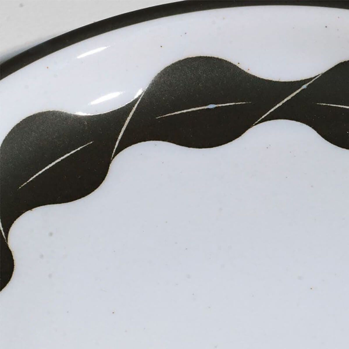 柄部分は黒い絵の具と撥水剤を混ぜて印刷しているため、施釉(釉薬をかける工程)の際に柄の上には釉薬がかかりません。その結果、柄はマットな黒の質感のまま、余白の白部分のみ釉薬で艶やかに仕上がり、地と図で異なる表情が生まれます。