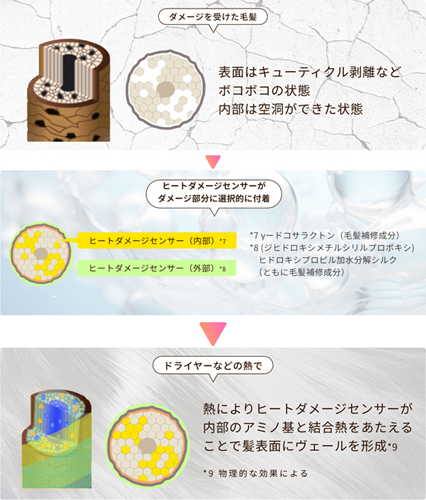 熱によってヒートダメージセンサーが髪の内側*6と外側*7にアプローチし、ダメージをケアしながらツヤのヴェールを作り、サラツヤな髪に仕上げます。