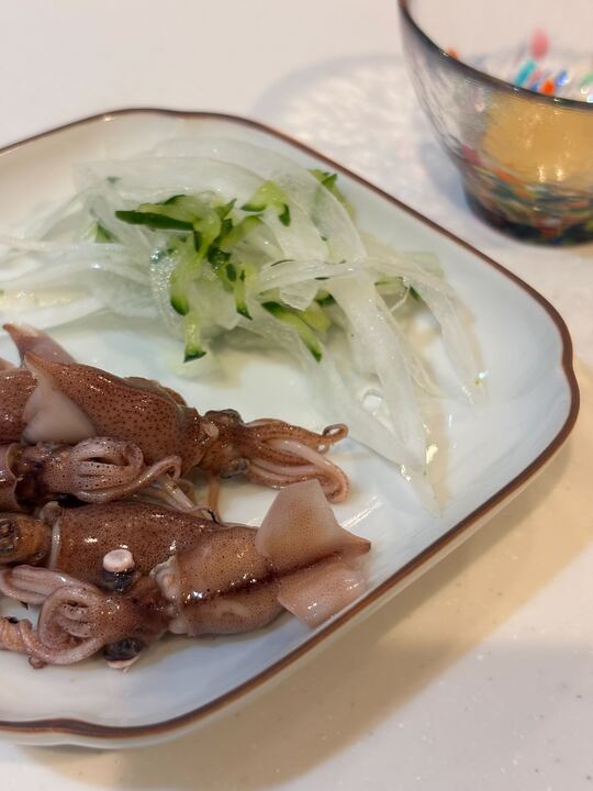 今日は旬のホタルイカをさっと茹でて、びいどろのお猪口に入れた酢味噌で。